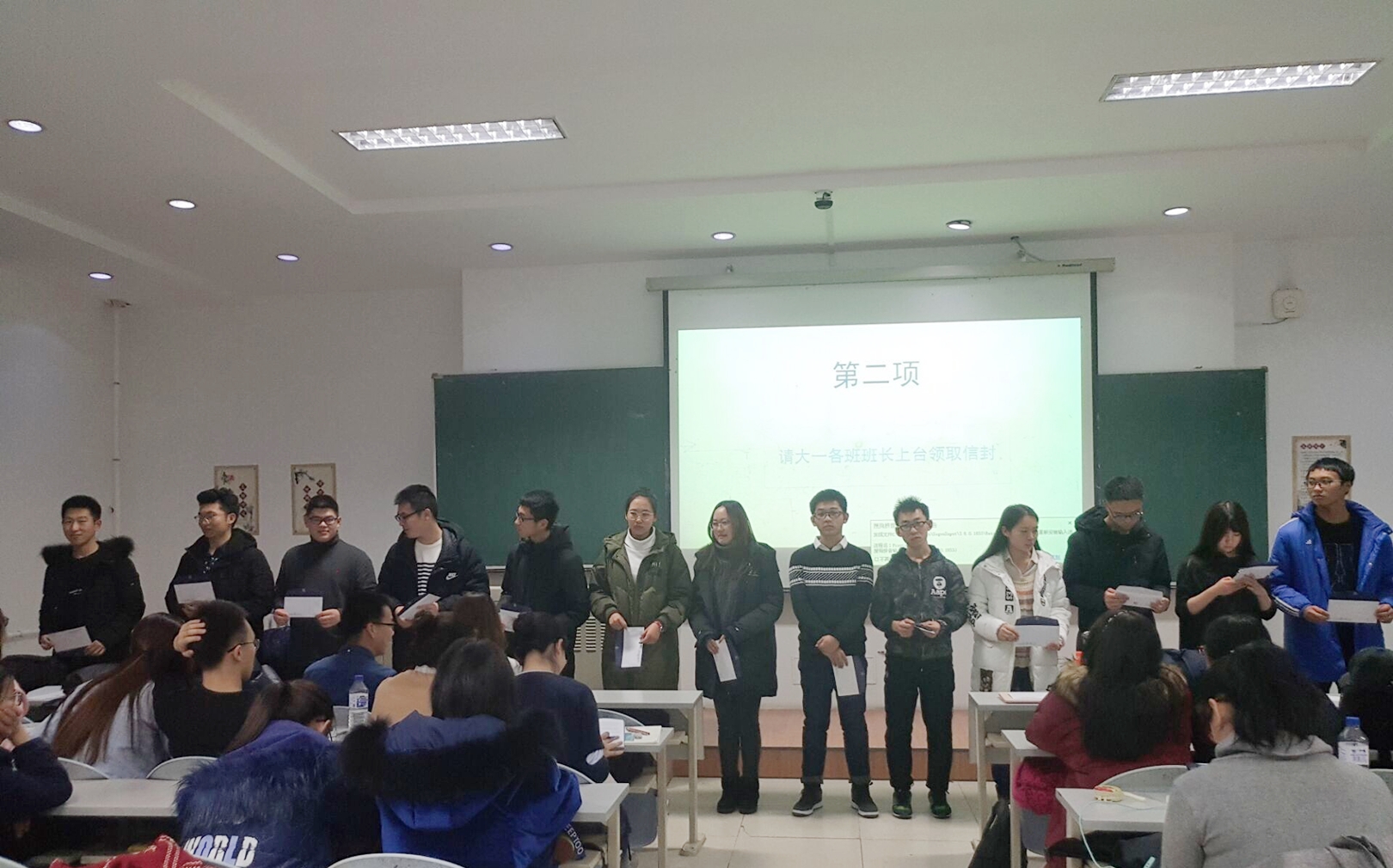 活动整体分为三个部分。首先,由主持人开场,向各位到场同学介绍活动的内容、形式和意义。第二个部分是主要环节:邀请各位大三的学长学姐与各位同学共同分享往年参加活动的感受。3522vip浦京集团官网15级社联工作部部长刘晓楠学姐,学生会副主席张旭龙学长和学生会主席张法学长分别上台,结合了自身的经历与感触,和大家分享了自己与未来一封信的故事。在分享的过程中,学长学姐们通过深刻的反思,诙谐的语言和谆谆的教诲把自己两年以来的心路历程与心得体会一一与大一的学弟学妹们做了丰富的分享,不时地赢得阵阵掌声。大一的同学们认真地聆听了深刻的讲话与分享,感触颇深,对自己的未来也有了一个完全不同的认识与规划。第三个环节是邀请大一各班班长上台领取信封。13位班长站上讲台,手举代表着希望与未来的信封,合影留念。