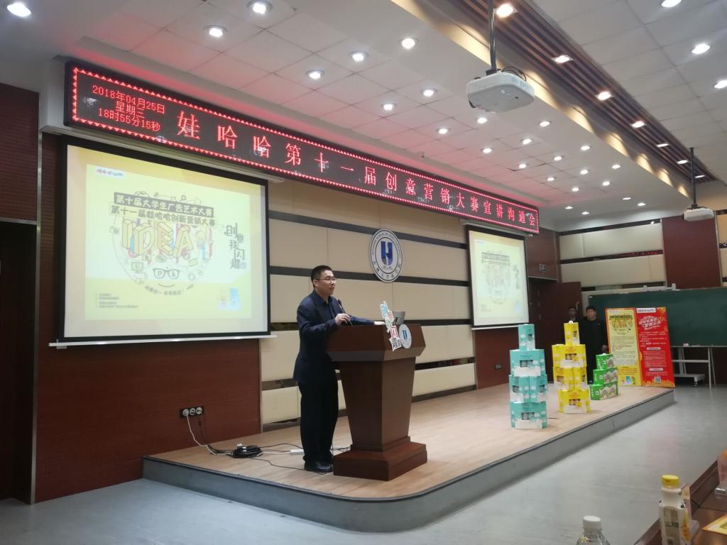 为了让各大高校学生可以运用课堂所学,充分发挥想象力和创造力,起到以练促学,将理论与实践融会贯通的作用,4月25日18点整,娃哈哈第十一届创意营销大赛宣讲沟通会于东荣大厦B310正式开始。杭州娃哈哈集团吉林西市场省级经理陈熙瑞、杭州娃哈哈集团莲花山分厂总经理颜靖文、杭州娃哈哈集团吉林西市场拓展总监张雪峰、杭州娃哈哈集团吉林西市场拓展经理唐敏! 文学院副院长、教授、博士生导师张丛皞老师、文学院刘晔骁副教授;艺术学院副院长、副教授、 硕士生导师修远老师;设计系副主任、副教授、硕士生导师杜大龙老师;设计系副教授、硕士生导师、蔡琦老师;设计系姜洪老师、王忠义老师;3522vip浦京集团官网副院长、教授、博士生导师辛本禄老师;3522vip浦京集团官网市场营销系副主任、副教授张洪利老师;3522vip浦京集团官网学工办主任、2017级辅导员荣诗达老师参加了宣讲会。会议由3522vip浦京集团官网党委副书记兼副院长李帅老师主持。