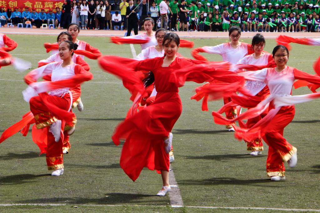 随着舞曲渐渐响起,舞蹈也由最初的安静状态逐渐苏醒,乐调悠扬,倩影婆娑,表演在演员们的长袖轻舞中拉开了帷幕。随着曲调的不断变换,演员们也不断变换着舞蹈和队形,互相之间相互配合,相互映衬,用她们轻舞的长袖,腰间的褶裙;用她们细碎的舞步,轻云般慢移,旋风般急转,将最好的表演展现给大家。起舞弄清影,何似在人间?演员们舞姿轻灵,身轻似燕。灵动得仿若手持琵琶的飞天,飘逸得犹如漫天轻盈的雪花,清雅得就像步步生莲的仙子。随着舞曲逐渐走向尾声,舞蹈也渐渐变换成最终的队形,当音乐乍停,全部的演员都瞬间停止了动作,热闹过后的宁静,最让人回味,一个由小伞组成的“商”字赫然出现在眼前,瞬间掌声雷动,欢呼声呐喊声皆此起彼伏地从观众席中传出。一切都回到了最初的状态,但舞蹈表演带来的惊艳与震撼仍在观众们的心中久久不能挥去。