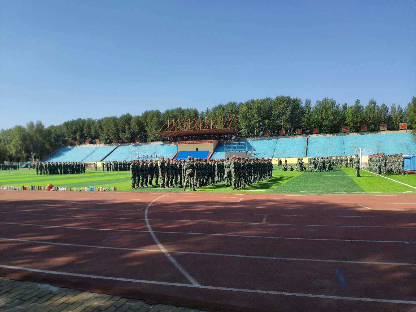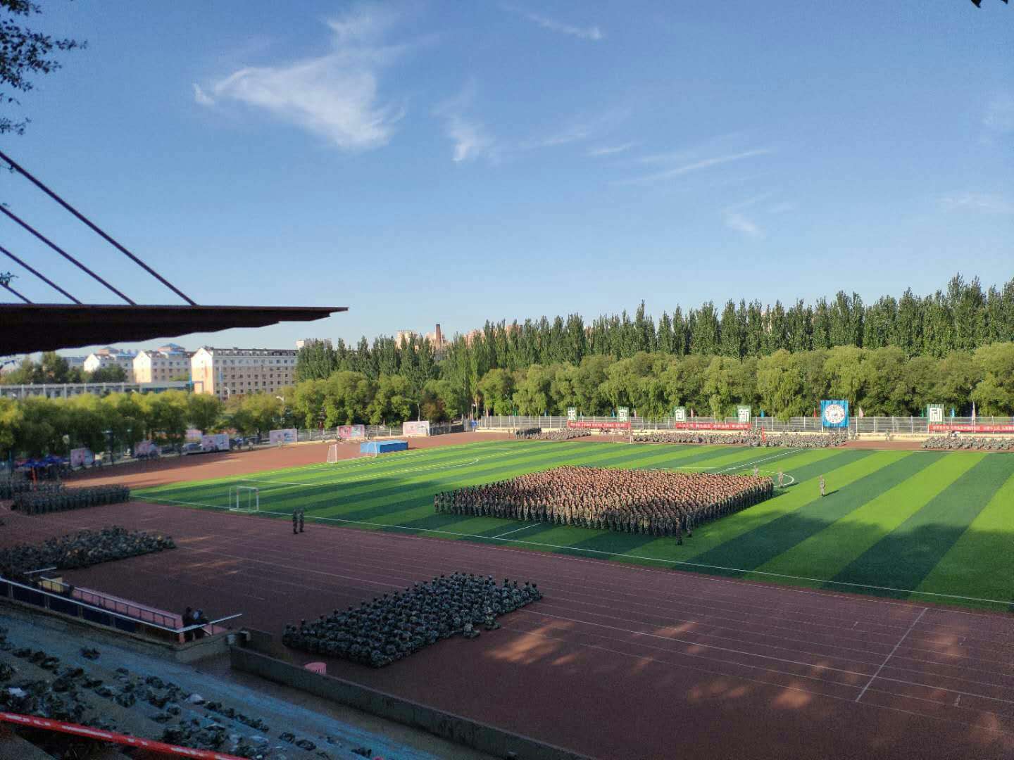 在军训初期,多阴雨天气,正在如火如荼训练中的新生随时都可能迎来一场瓢泼大雨,而这些却并没有影响他们坚挺的身姿、整齐划一的步伐。而如今好不容易送走了阴雨,却迎来了烈日骄阳。由于军训接近尾声,所有人都在为了最后能够在全校面前展现出他们最出色的一面而加紧训练。还未靠近操场,便听见了他们高昂嘹亮的口号声,再走进些便可听见他们铿锵有力的步伐声。即便已经入秋,阳光依旧毒辣,新生们专注于训练,不一会便已汗流浃背,即便有些疲惫却没有人退缩,每一个人都目光炯炯、精气神十足。
