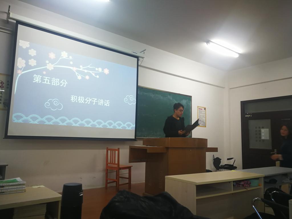 接下来,由组委杨铠翔同学向大家介绍了“共青团中央”微信公众号及其使用方法,并邀请全班同学关注该为微信公众平台。紧接着团支书邀请入党积极分子代表朱洪宇同学发表自己关于“青年大学习”的见解并鼓舞同学们“紧跟时代,砥砺前行,担当责任,奋发有为。积极加入党的建设队伍,坚定信心,勇做时代弄潮儿。”