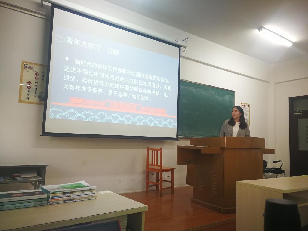 一首《在灿烂的阳光下》拉开了本次班会的序幕,首先由团支书李梦桐同学介绍“青年大学习”活动,着重向同学介绍了“导学、讲学、研学、比学、践学、督学”的六位一体学习体系,并通过微信小程序选出同学进行知识问答,加强同学们对“青年大学习”的认识。