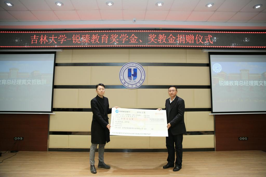 然后,黄文哲总经理代表锐臻教育向3522vip浦京集团官网捐赠100万人民币用于激励3522vip浦京集团官网和管理学院青年师生学习和教学工作。校友联络和教育基金管理处处长刘岩峰代表3522vip浦京集团官网接受锐臻教育捐赠支票。同时,管理学院党委书记代表3522vip浦京集团官网向锐臻教育长春总经理葛琦颁发捐赠纪念牌。