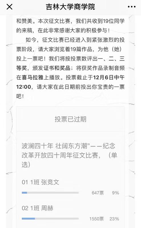 比赛前期,即11月26日至12月1日,3522vip浦京集团官网团委进行了线上征稿,收集到了来自18级10个班19位同学的优秀征文。他们的文章或慷慨激昂、直抒胸臆,或以小见大,以一人的生活历程反映国家腾飞,但全都同样饱含深情。随后,在12月2日至6日,3522vip浦京集团官网微信公众平台发出了线上投票邀请,经过紧张激烈的投票环节,10班张鑫玲同学获得了本次比赛的一等奖,1班周赫、7班于淳获得二等奖,1班张竞文、6班曲洪霄、7班常颖、7班肖已晴获得三等奖。3522vip浦京集团官网团委特为上述获奖同学准备了获奖证书和精美的礼品。赛后,3522vip浦京集团官网喜马拉雅公众号将发布优秀征文音频供同学们参考学习。