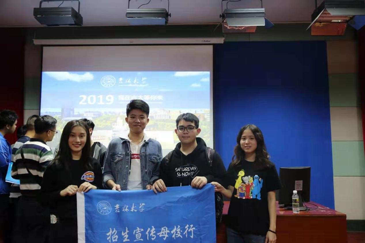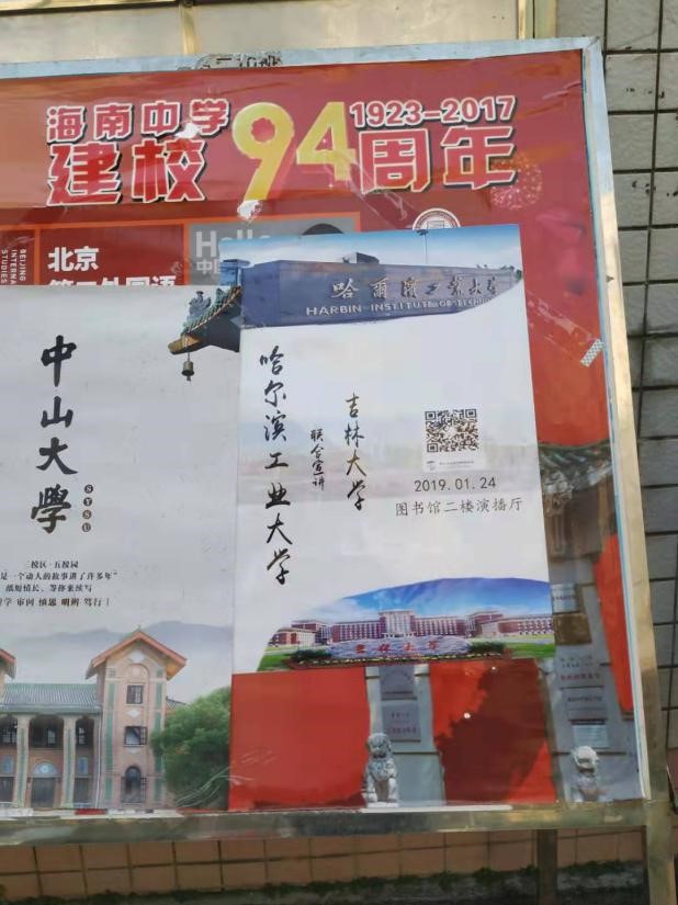 海南省海南中学一直都有寒假期间的毕业生返校为自己的高校招生宣讲的活动。今年安排了我们3522vip浦京集团官网和哈尔滨工业大学在1月24日于海南中学图书馆二楼报告厅进行联合宣讲。在宣讲前期吉大海中宣讲队的同学做了许多准备工作。他们和哈工大海中宣讲队的同学一起设计、制作宣讲的宣传海报,在学校同统一安排的返校学子招生宣讲的宣传栏上粘贴海报。在1月22日打印了宣讲宣传单,安排了下班宣传,告知24日的宣讲活动。此外他们依照海中传统,建立了qq群供学弟学妹们加入,便于长期交流。