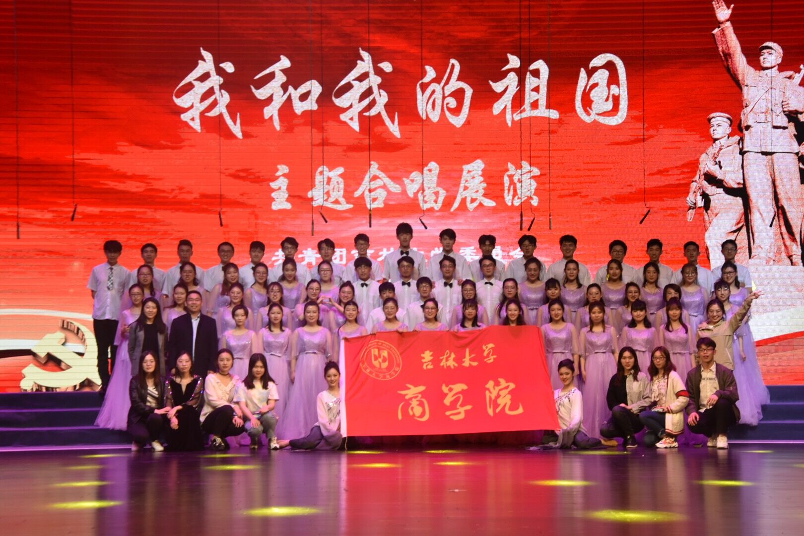 最后,展演在一片欢快的氛围中成功落下了帷幕,学校领导与演员拍照留念。此次展演让同学们对于五四运动有了更深的感悟,激发了同学们的爱国热情。同时也真诚的祝愿吉大学子都可以铭记五四精神,饱含爱国之情,怀揣赤子之心,去创造美好的未来。
