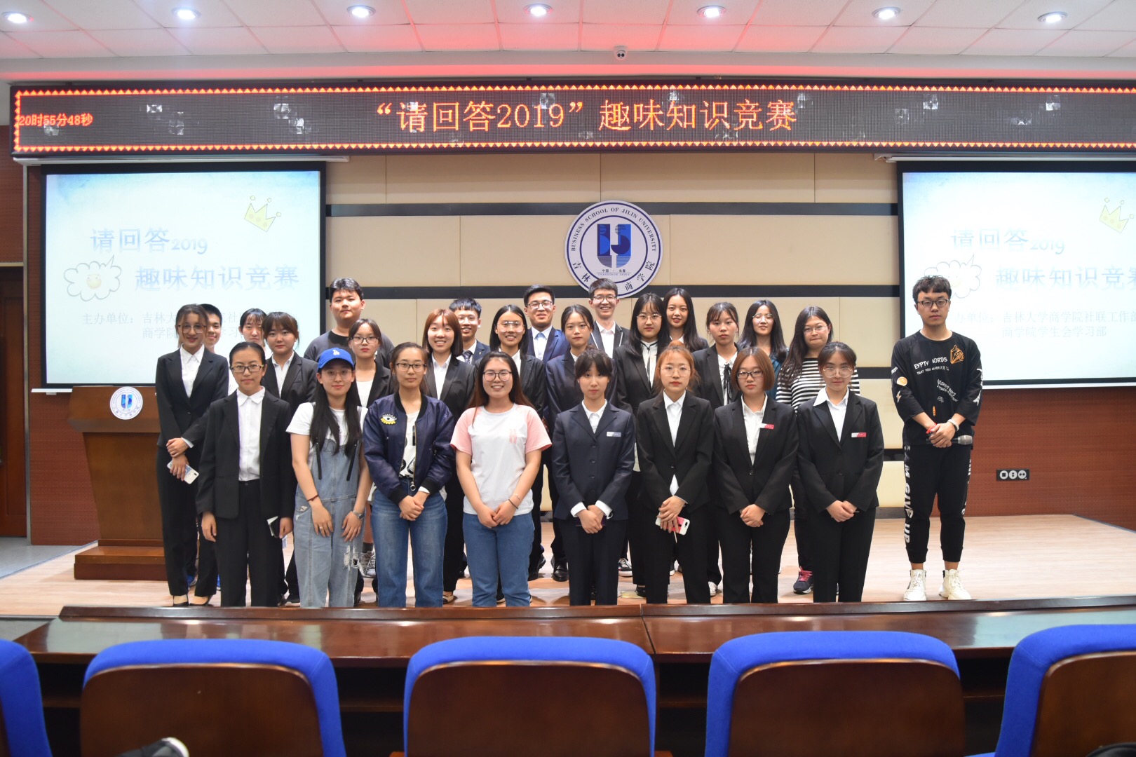 本次竞赛共有三个环节,分为团体赛和个人赛。第一环节是团体赛第一轮,共有19个队伍参与比赛。先由每队代表抽签决定题组编号,按照题组编号各队顺序依次上台答题,答题时所有成员一起做答,答题时间为九十秒,每答对一题积一分,跳过或答错不扣分,跳过机会不限,答题上限 25 道题。本轮比赛题目涵盖地理,娱乐,军事等方面,还有许多贴近吉大同学们生活的小知识。比赛一开始,气氛就被幽默风趣的题目带动了起来,选手们集思广益,积极思考,充分展示出了自己的知识储备。