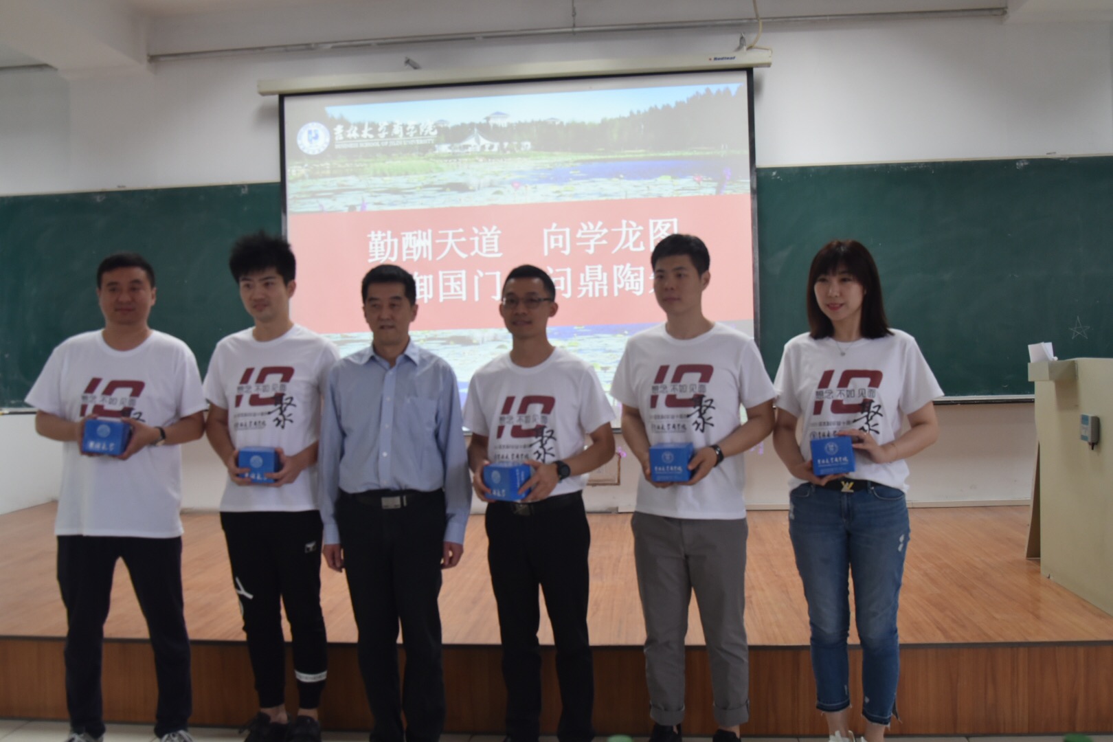 接着,到场的各位老师为校友代表佩戴院徽,张世伟院长向校友代表赠送了学院准备得纪念品。