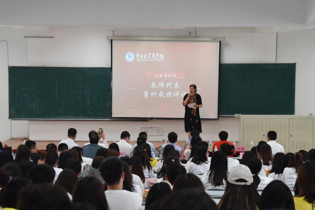 随后,由教师代表董竹老师讲话。董竹老师表达了对学生的殷切期望,并且向即将毕业的同学们悉心叮嘱了三点:一是珍惜友情;二是耐住寂寞;三是寻找幸福。每一点都深入人心,直至心灵。