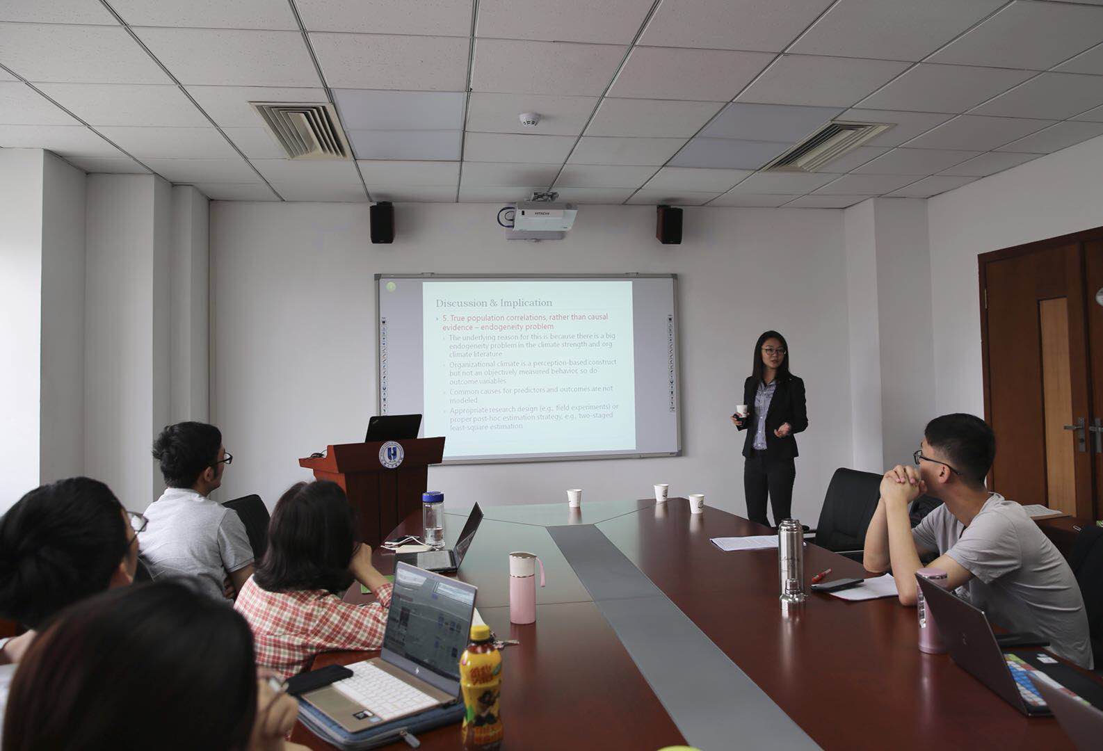 讲座开始,丁博士先为大家简要介绍了自己在香港理工大学硕士和瑞士洛桑大学博士的求学经历,以及在美国马里兰大学博士后的工作心得。随后,丁博士重点讲解了自己对组织氛围的研究情况,包括顾客员工连接、策略氛围、氛围强度等内容,而本次报告的文章也是系列研究之一。这篇文章的灵感来源于当前已有研究结论——氛围强度调节组织氛围水平与结果的关系的不一致。在此基础上,文章找到了5个前因变量,分别是雇员差异性、组织规模、社会关系和沟通、领导及组织对规章的强调。除此之外,依据已有的研究提出研究设计、氛围类型和氛围衡量方式3个主要因素影响氛围强度的调节作用。并且使用元分析的方法归纳汇总已有研究的数据,对提出的假设进行验证。元分析作为一种成熟的分析方法,适合于已有丰富的研究基础的情况,利用元分析可以解决有争议的问题,指明未来的发展方向。丁博士生动而详实的讲解让大家受益良多。
