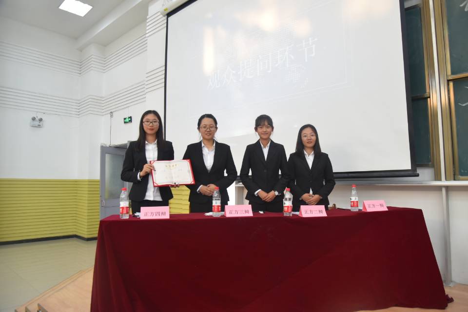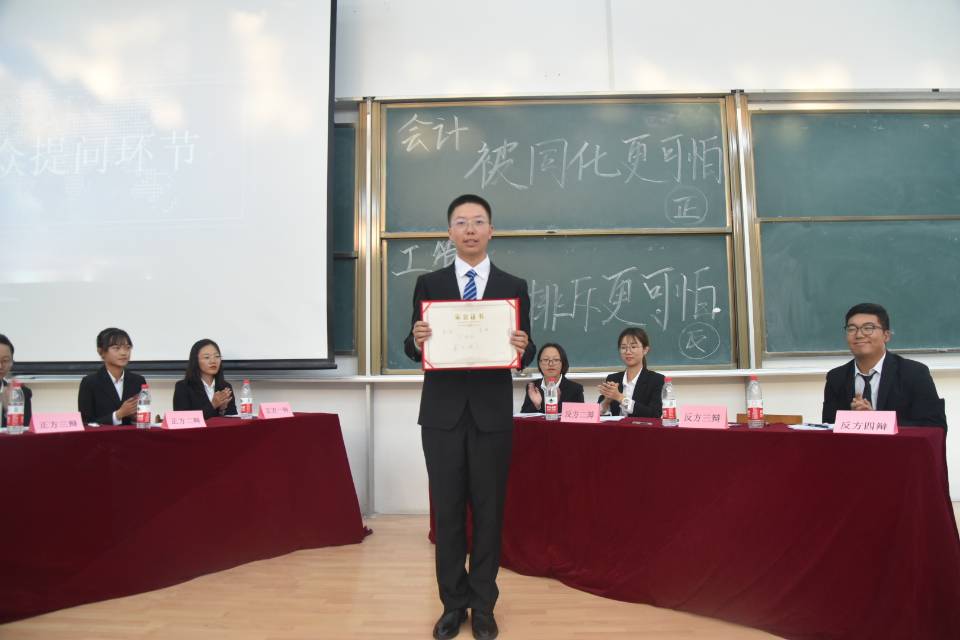 赛后,16级辩论队领队刘泽霄学姐对本场比赛做出了点评,分享了自己作为一名商院辩手在三年里有关辩论的诸多感想,并宣布了本场比赛的获胜方为正方会计大类代表队,最佳辩手为反方三辩,并由金博老师为他们颁奖并合影留念。