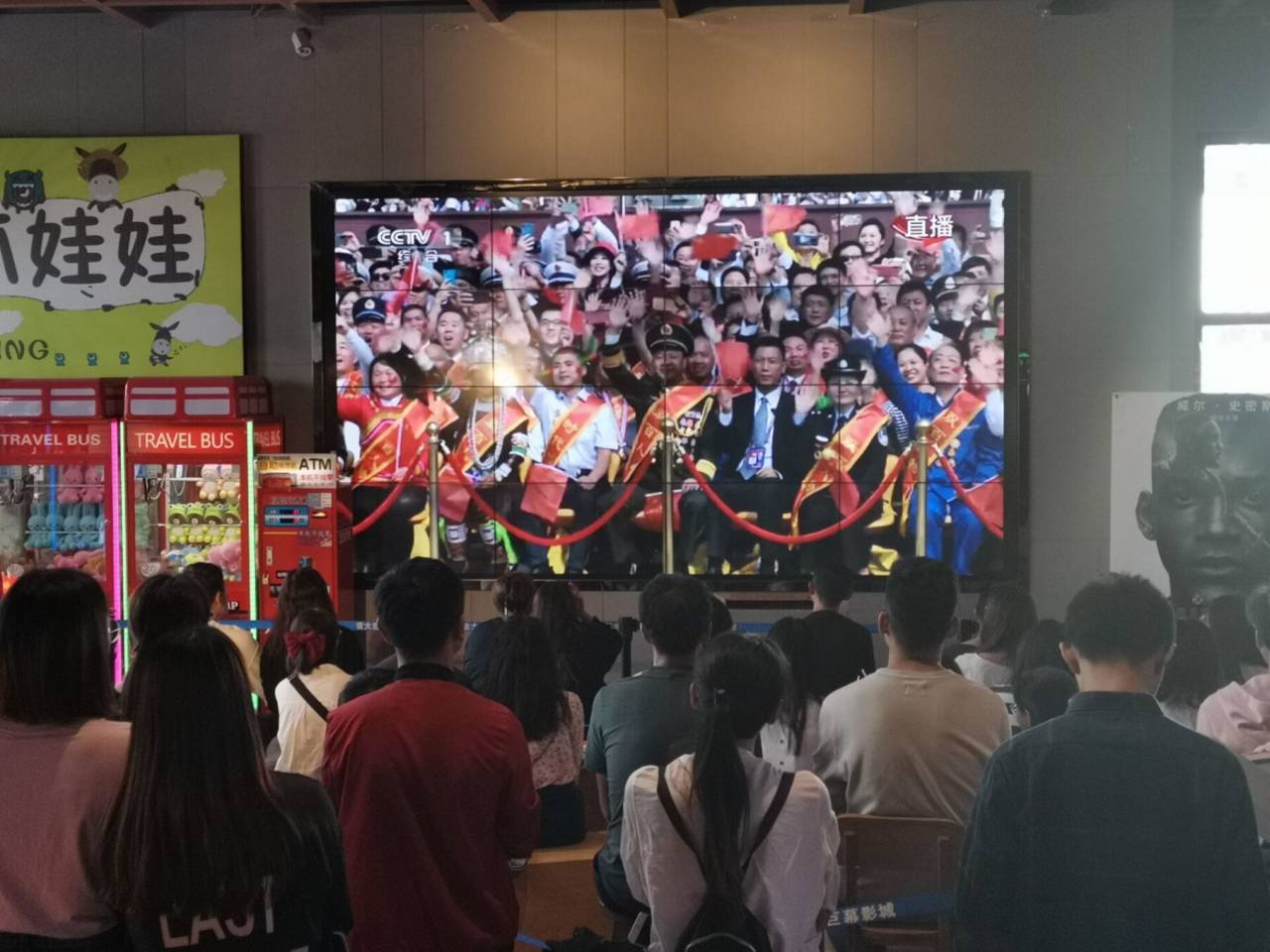 当直播到分列式时,国庆期间留校的2019级新生李梦雪在社交平台发表了此时此刻难以压抑的激动心情:“军训结束不久,分列式的辛苦仍历历在目,但我看到了人民解放军整齐划一的排面,铿锵有力的口号,掷地有声的脚步,我要为我们的中国人民解放军报以最热烈的掌声,祖国万岁!”。