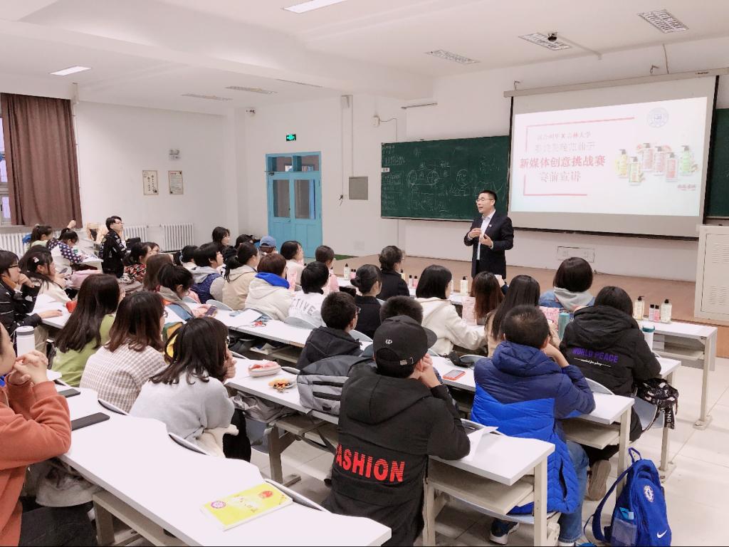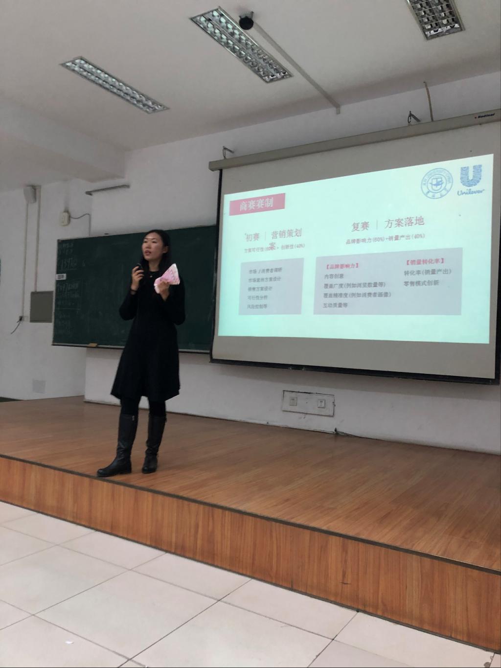 然后,联合利华营销经理开始了对大赛的介绍,讲述比赛规则,分享自己的营销经验,给予同学们对于比赛的提示。