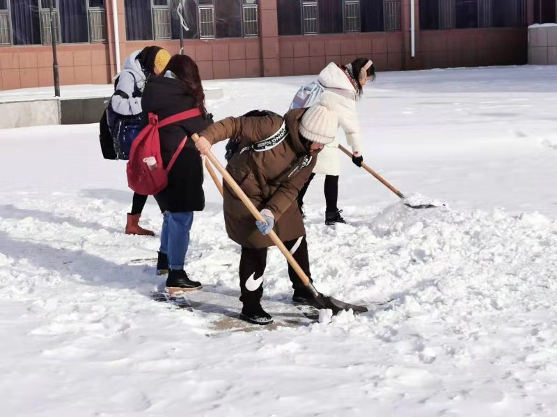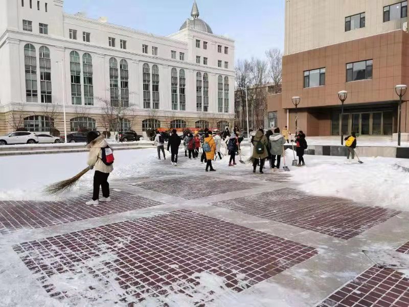 在第一次扫雪顺利完成之后,同学们扫雪服务大家的热情高涨,11月18日下午1点30分,学院领导、老师再次组织2019级同学及党员和入党积极分子前往萃文楼前广场清除积雪。扫雪众师生,不畏严寒,顶着风雪,按照班级区域进行清扫,同学们积极奔赴自己的“战场”,挥舞着铁锹和扫帚对积雪进行“战斗”。师生齐心协力,配合默契,有的铲,有的推,有的扫,干的热火朝天,忙碌的身影在皑皑白雪中构成了一道亮丽的风景线。虽然室外温度很低,但同学们劳动的热情和团结的力量让这个冬日变得格外温暖。经过两个多小时的奋战,3522vip浦京集团官网师生终将萃文楼前广场的积雪全部清扫干净。