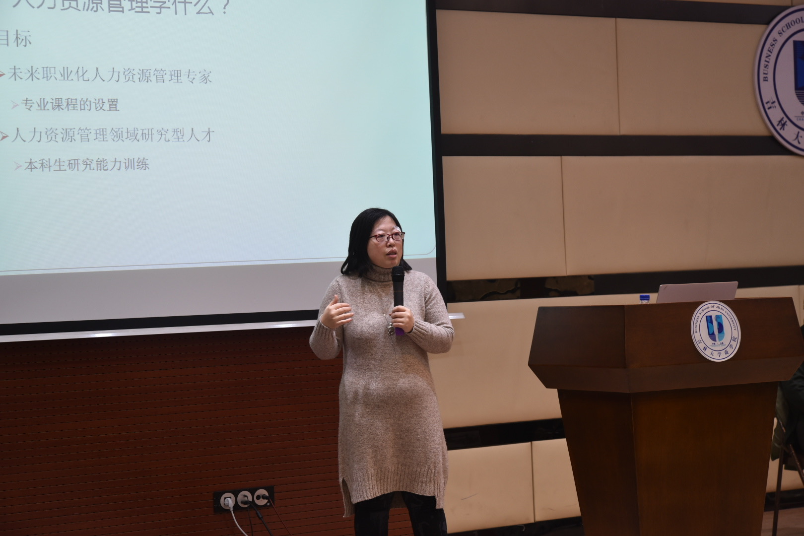 本次说明会共有两个环节。第一个环节,由王广慧老师主讲,从“什么是人力资源管理,人力资源管理学什么,人力资源管理各位老师的科研成果、教学、研究方向,专业的优秀毕业生”四个方面,向同学们全面介绍了人力资源管理专业。为了让同学们更全面地了解人力资源管理专业,王广慧老师还为同学们精心整理了近几年专业内各种活动的照片,在场的同学们情绪高涨、被老师所讲的内容深深吸引。