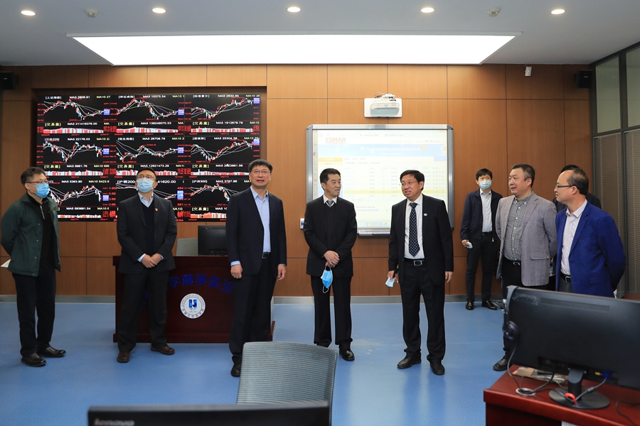 会前,张希校长、蔡立东副校长在学院张世伟院长、闫国生书记的陪同下参观了商学实验教学中心股票模拟大厅。