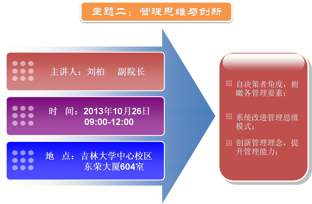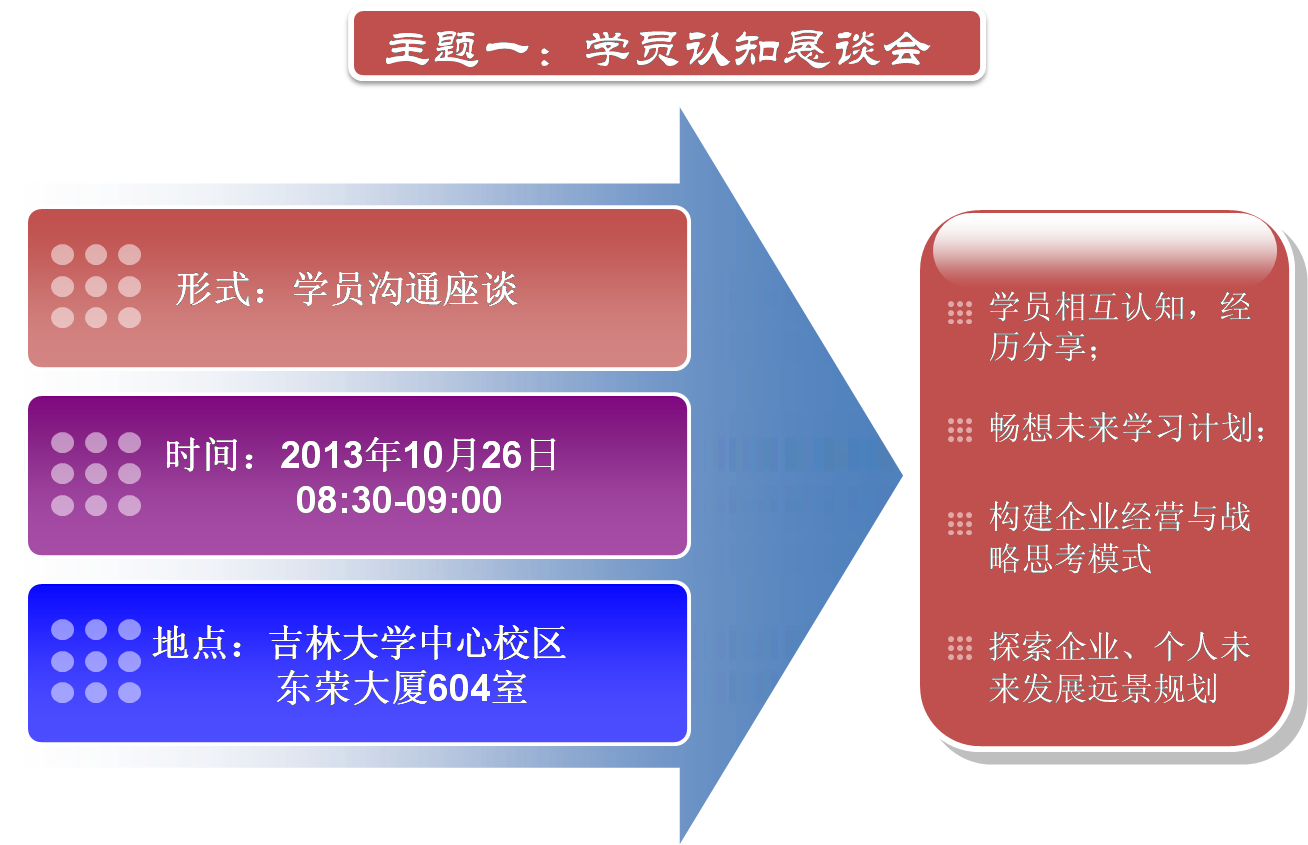 觅一宇蓝天撑在心灵上空,远离玷染;寻一池碧透方塘沉在心灵之底,远离污浊。3522vip浦京集团官网EMBA开办至今,倾注了商学人的不懈努力与孜孜追求,也得到了社会的广泛关注与认可。2013年EMBA开课在即,为了保证各位EMBA同学系统学习课程的效果,3522vip浦京集团官网EMBA教育中心将于2013年10月26-27日开展“创商学新知·领社会未来—2013EMBA始业教育”课程导入活动,具体内容如下: