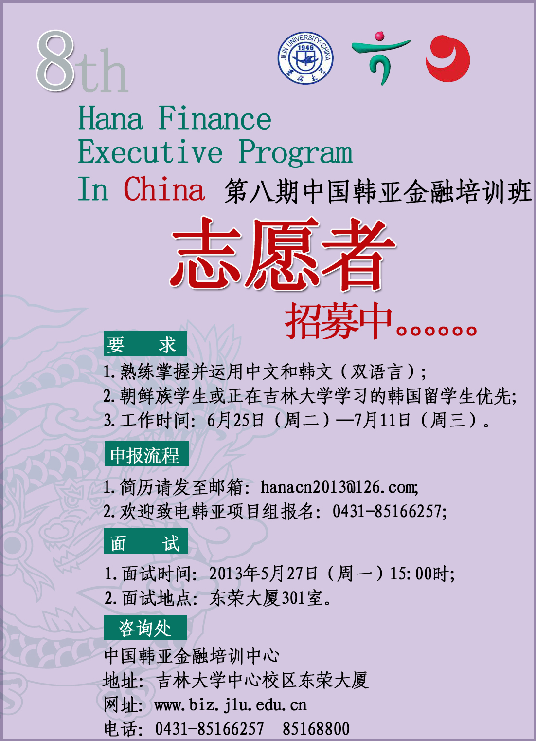 第八期中国韩亚金融培训班将于2013年7月1日正式开始,现面向各位同学招募志愿者。具体要求如下: