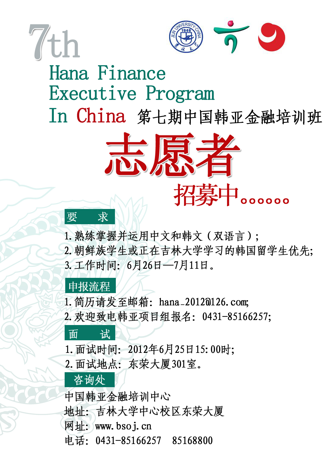 第七期中国韩亚金融培训班将于2012年7月2日正式开始,现面向各位同学招募志愿者。具体要求如下: