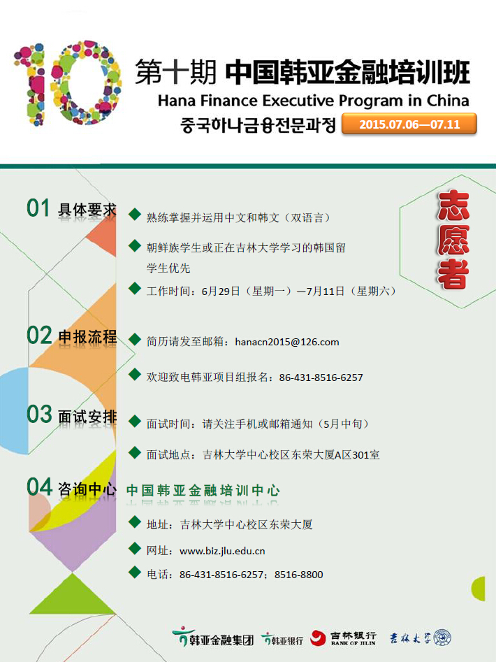 第十期中国韩亚金融培训班将于201576日正式开始,现面向各位同学招募志愿者。具体要求如下: